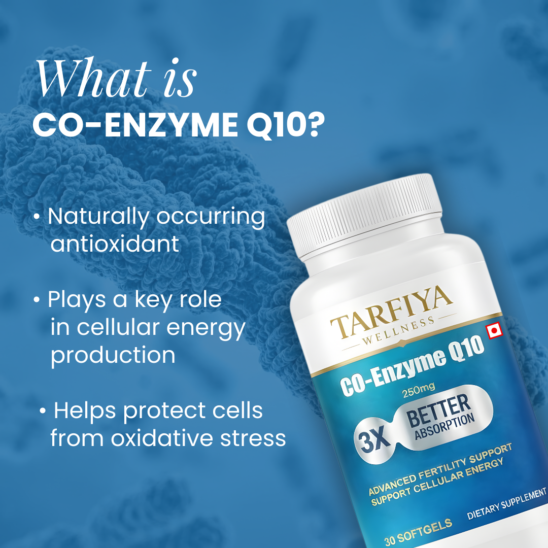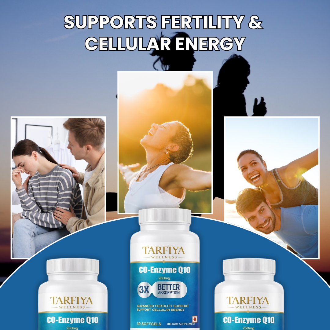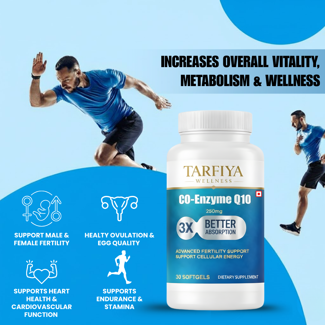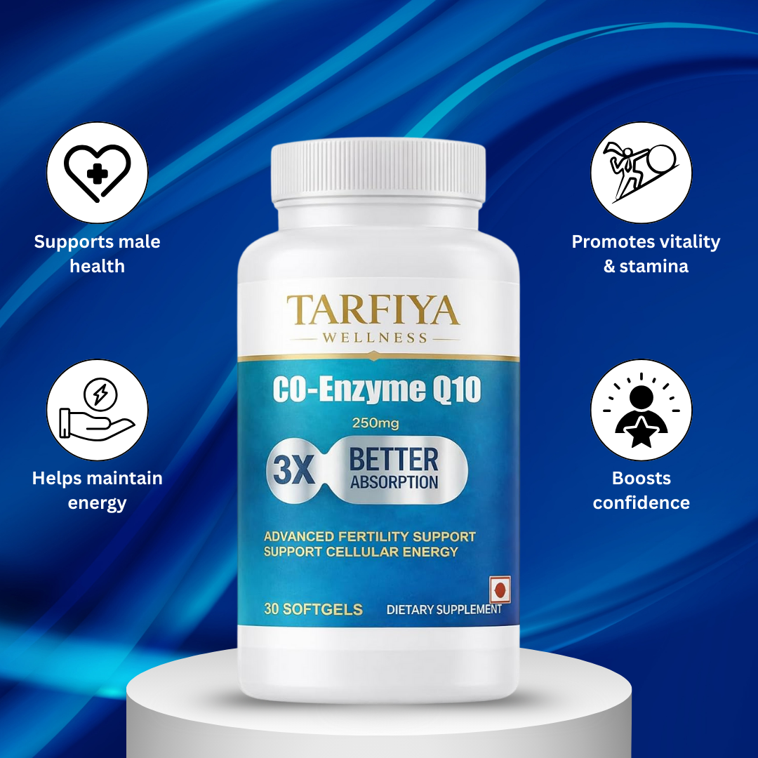 Tarfiya Wellness Co-Enzyme Q10 (CoQ10) Softgels is a premium dietary supplement formulated to support the body’s natural energy production and overall wellness. CoQ10 is a powerful antioxidant that plays an important role in cellular energy generation, helping support daily vitality and an active lifestyle. This advanced formula is designed with 3X Better Absorption, allowing the body to utilize CoQ10 more efficiently. Regular use supports cellular energy, heart health, and general well-being. The easy-to-swallow softgel format makes it convenient for everyday supplementation. Manufactured with quality and safety standards, Tarfiya Wellness CoQ10 is suitable for daily use as part of a balanced diet and healthy lifestyle.